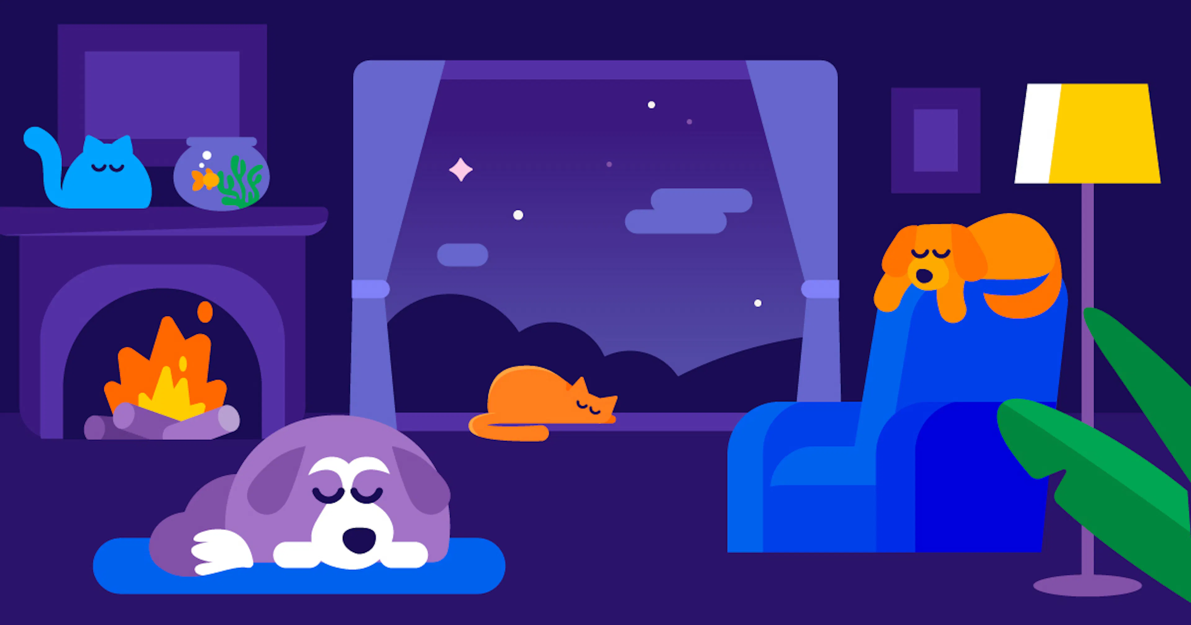 Composed to be calm and soothing, this six-hour track uses slow tempos, simple patterns, and gentle variation to help pets relax. It’s illustrated with pets in mind, using a dark, soothing color palette and slow, predictable movement to avoid overstimulation.